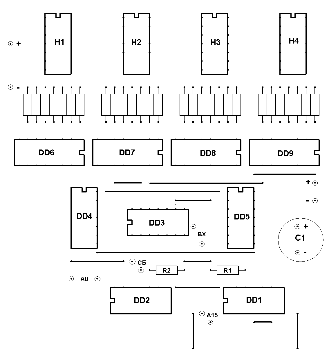 Соединение выводов регистров с ПЗУ и ПЗУ с индикаторами выбрано не по порядку, исходя из расположения деталей на плате.